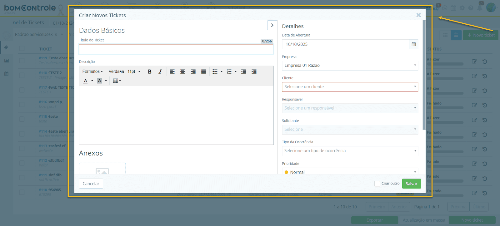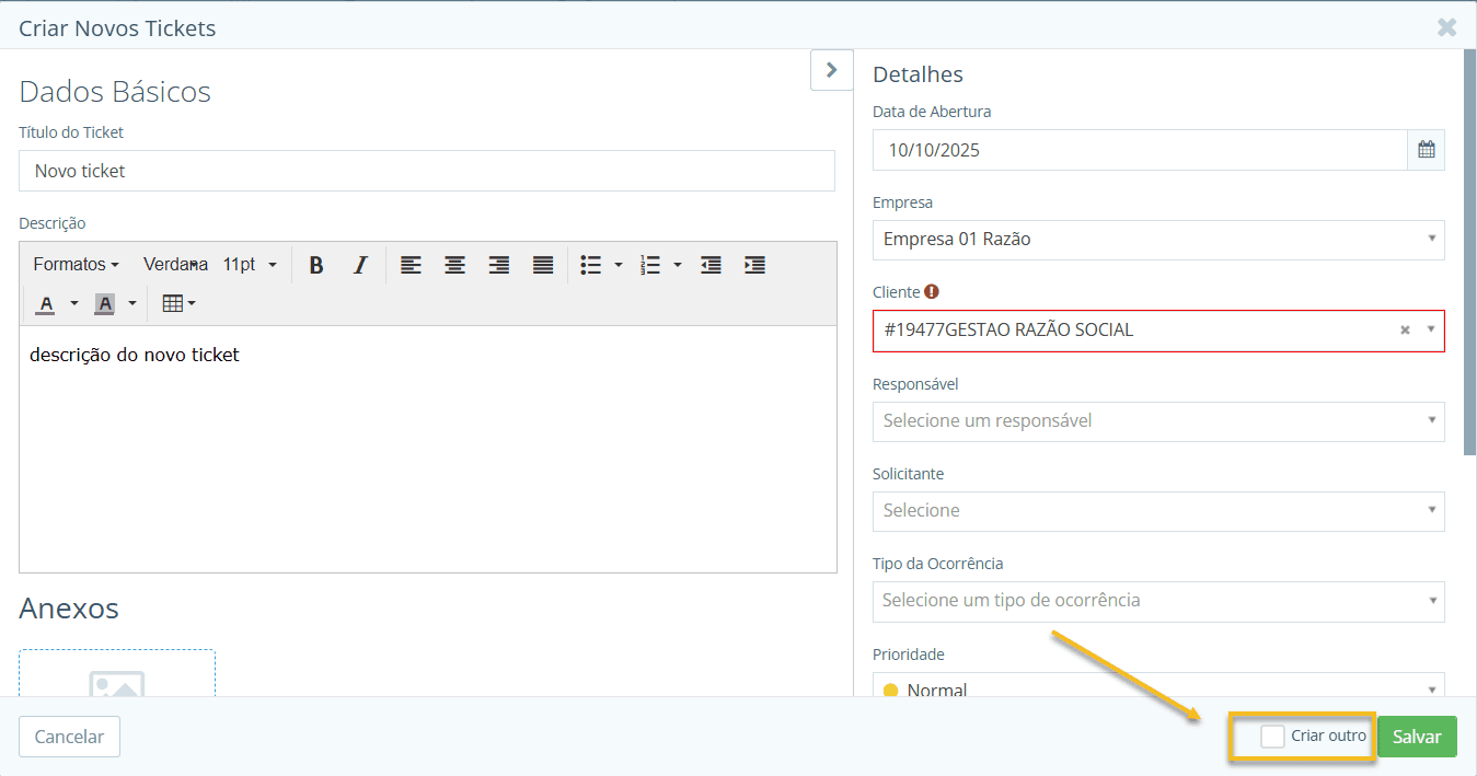 Impacto: essas informações textuais não têm efeito em outros módulos, mas o título e descrição adequados facilitam o entendimento e a busca do ticket.