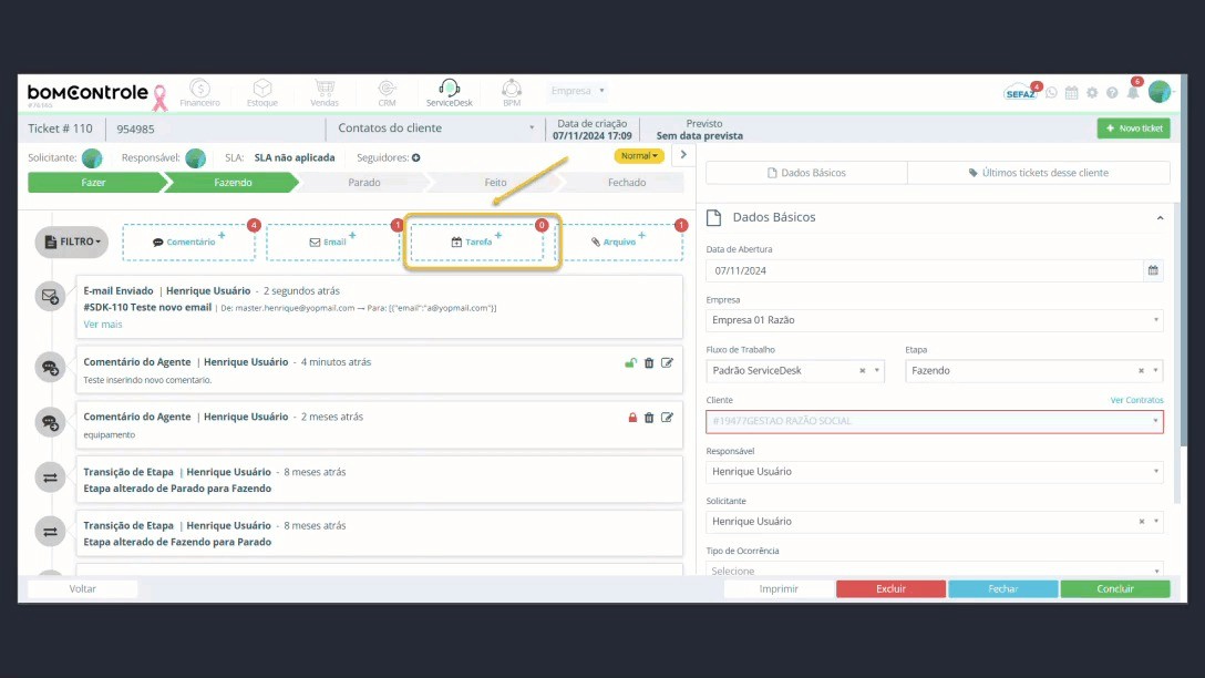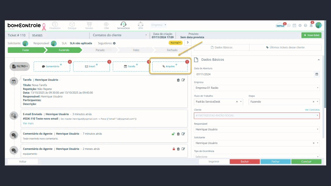 Anexa Arquivos (log, screenshots) e agenda Tarefas (visita técnica, etc.) conforme necessário.