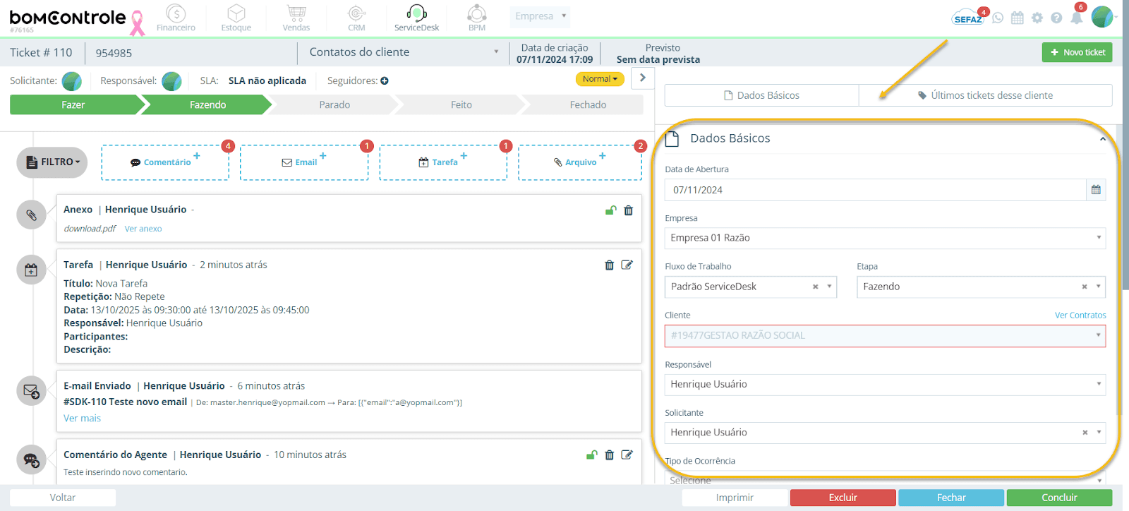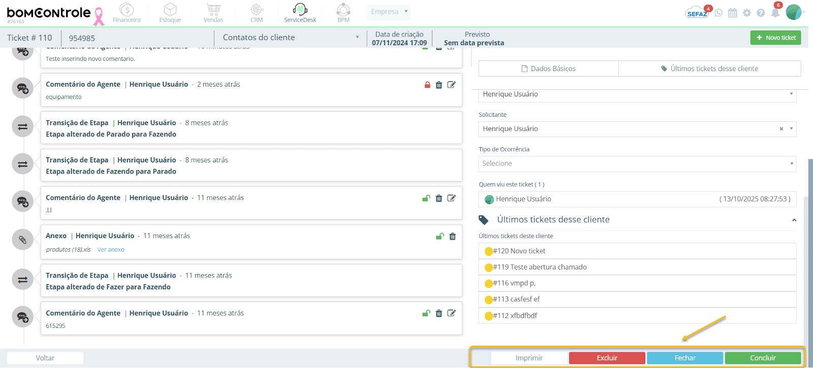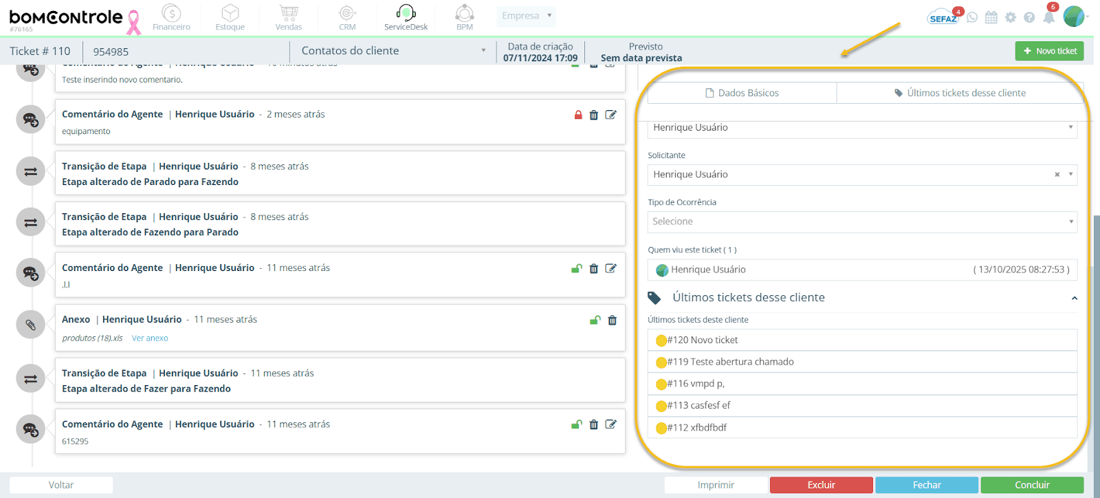 O ticket fechado é arquivado, podendo ser consultado no futuro (pela aba de Últimos tickets, ou busca de históricos).
