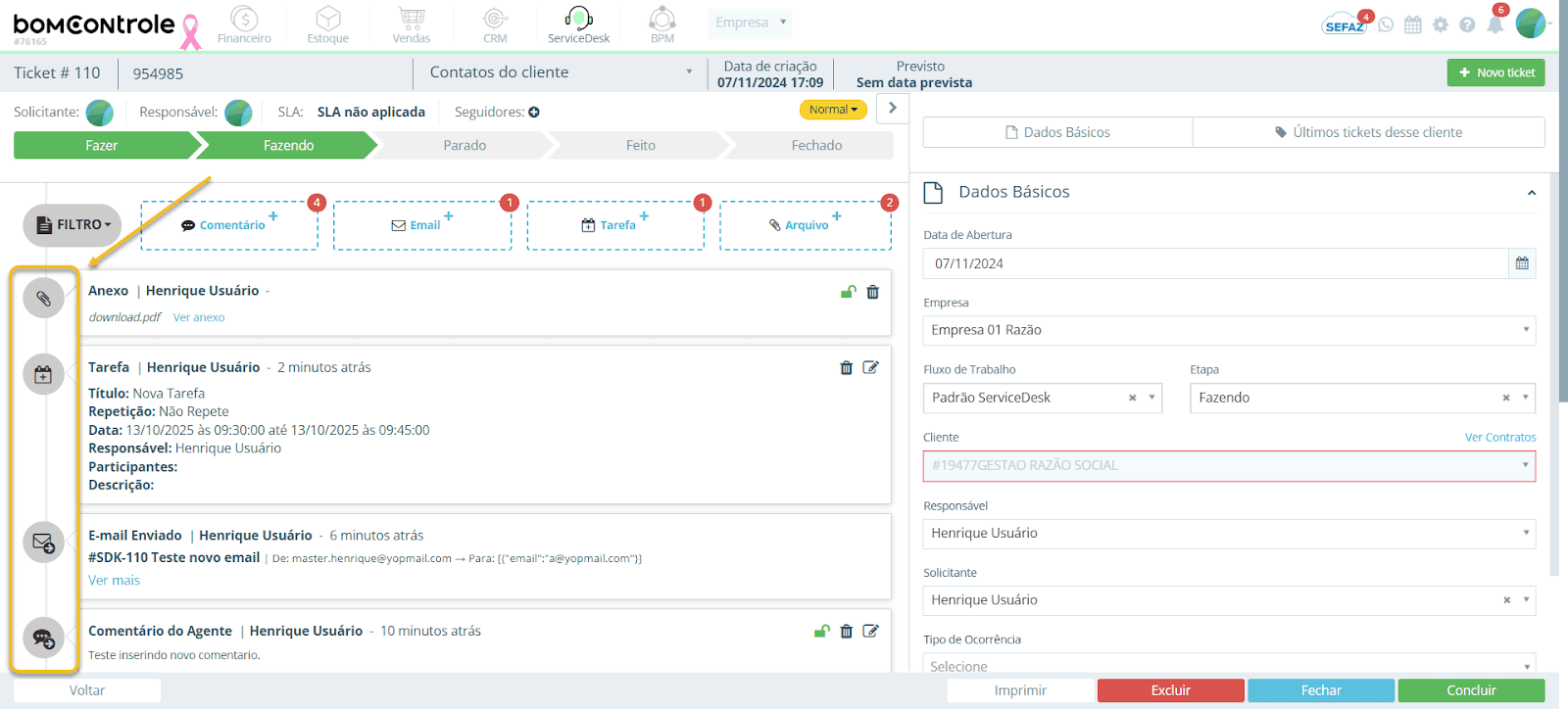 Impacto: o fluxo e etapa são internos do módulo ServiceDesk. Mudar de etapa não produz efeitos diretos em outros módulos, mas indica o progresso do atendimento. Por exemplo, um ticket na etapa “Aguardando Aprovação do Cliente” pode sugerir que em vendas uma proposta foi enviada – mas isso depende da ação do usuário, não ocorre automaticamente.