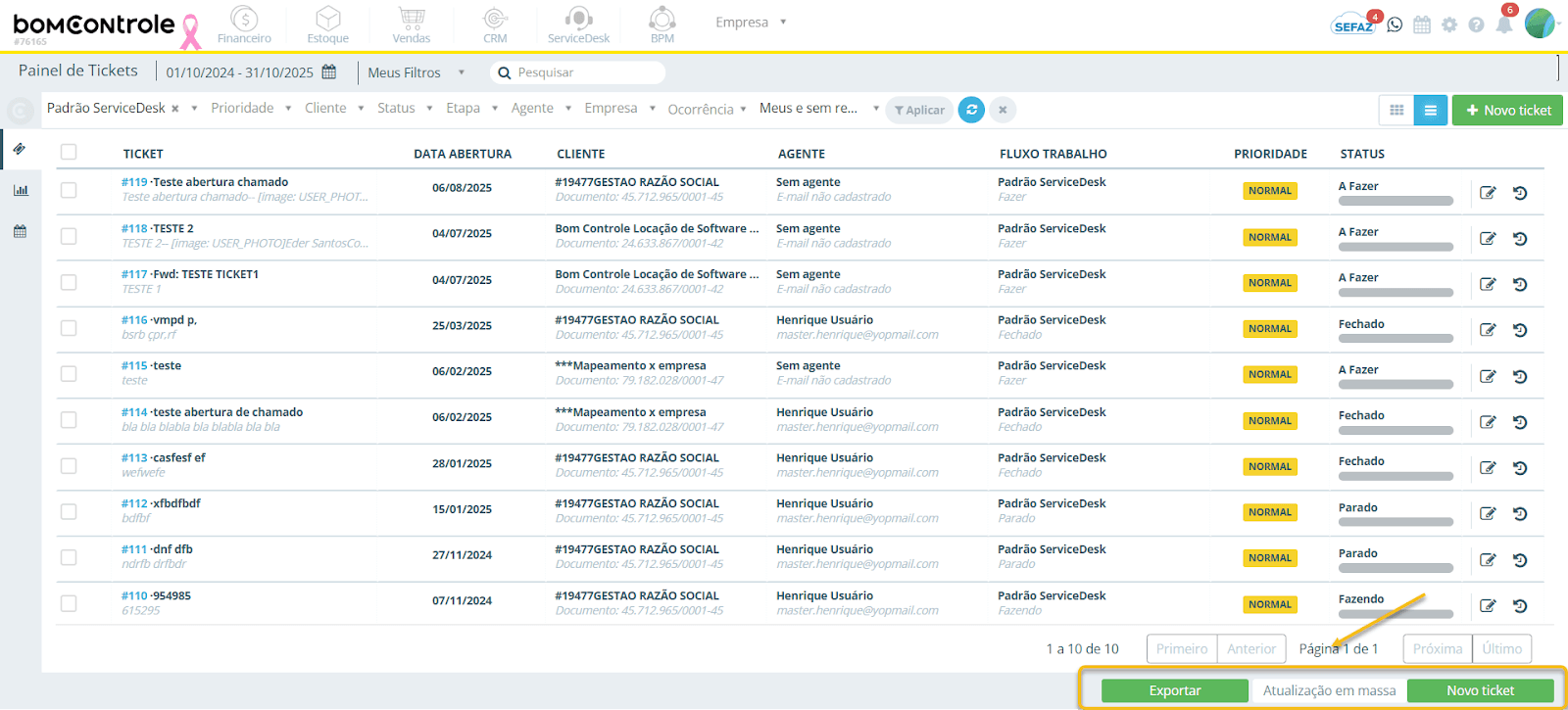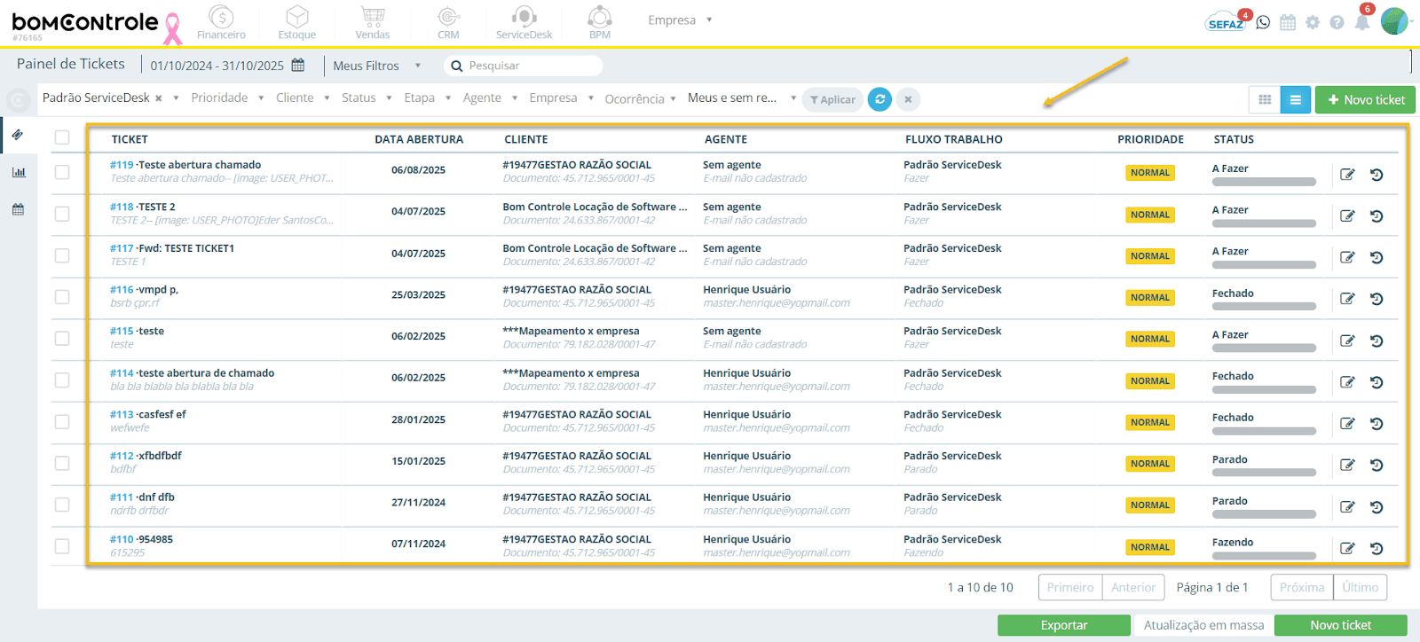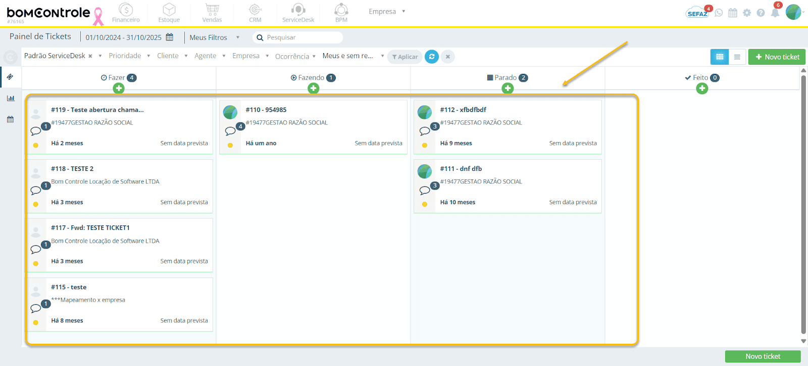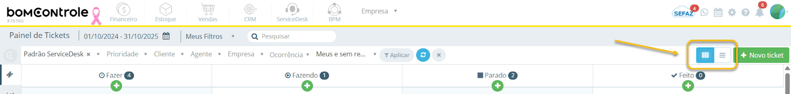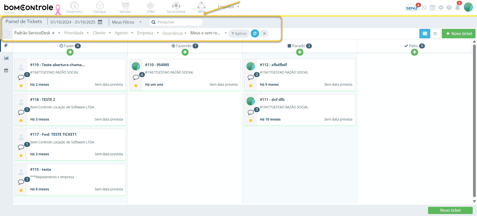 Logo no topo da tela encontram-se diversos filtros que permitem localizar e segmentar os tickets desejados: