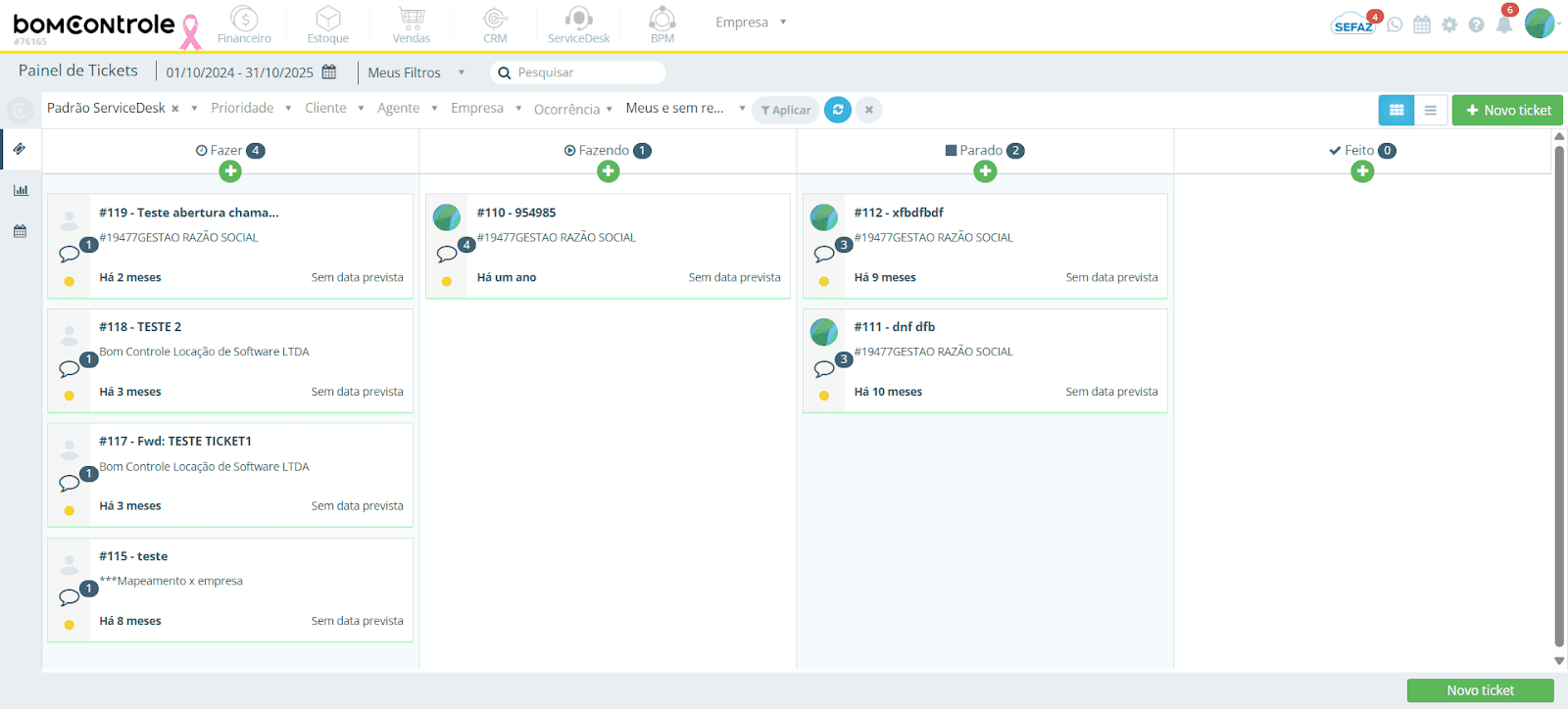 Este manual tem como objetivo orientar o usuário final no uso do Cadastro de Tickets ServiceDesk no sistema BomControle, de forma detalhada e simples. Serão explicadas todas as partes da funcionalidade – desde a tela de pesquisa/listagem de tickets até o formulário de novo ticket e a tela de detalhes – incluindo regras de preenchimento de cada campo e como cada informação impacta outros módulos do sistema (estoque, financeiro, vendas e emissão de notas fiscais).