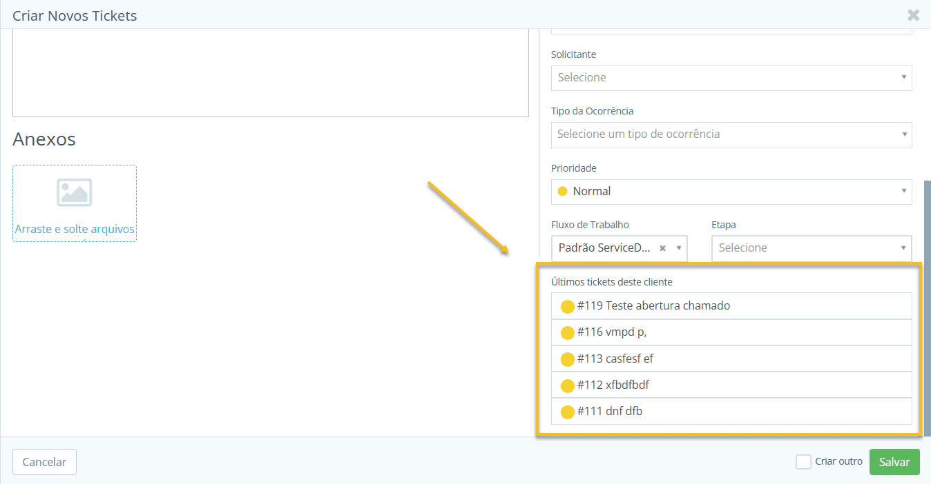 Esta seção se atualiza automaticamente se, por exemplo, você fechou um ticket e abriu outro para mesmo cliente – ela vai refletir agora incluindo o que acabou de fechar (porque se tornou um dos últimos).