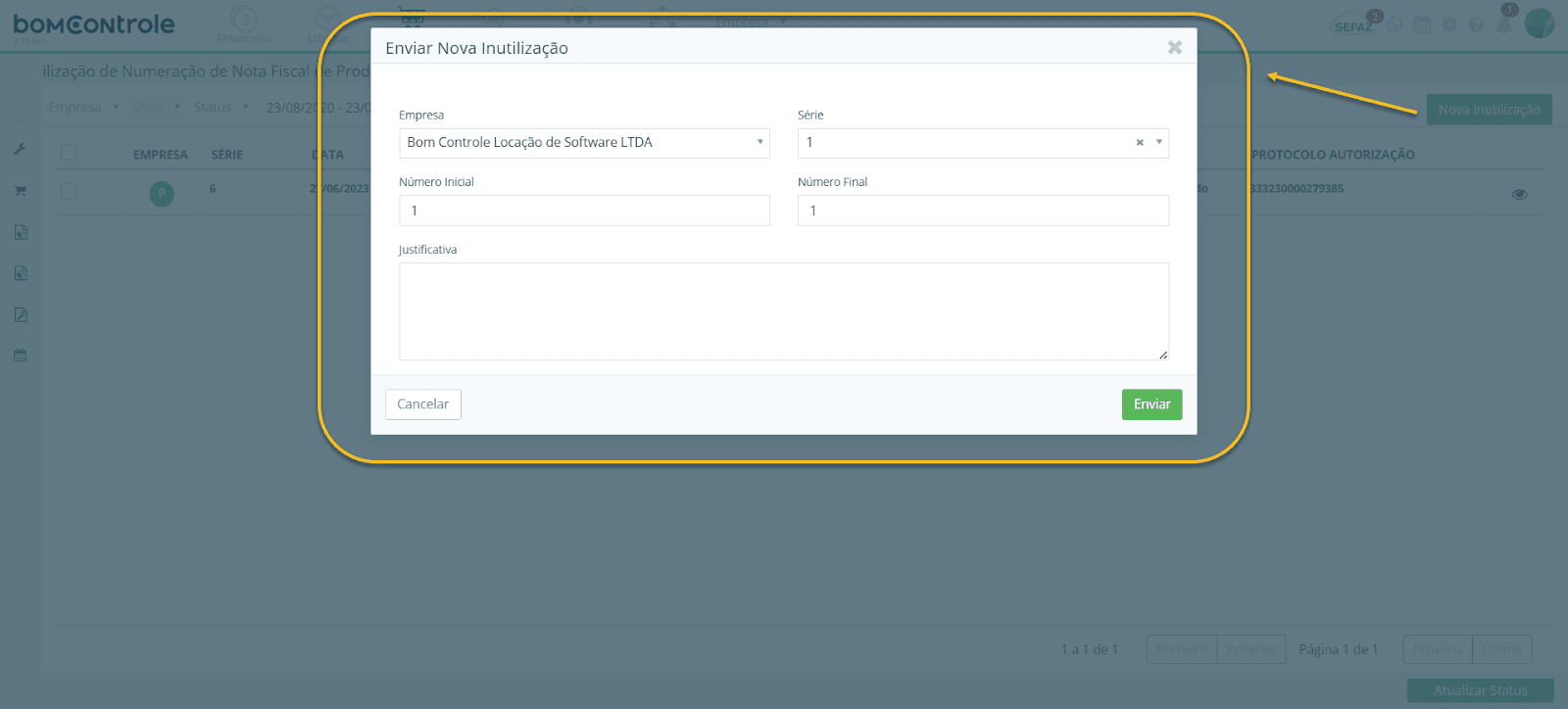 Enviar: (botão de ação) após preencher todos os campos acima, clique em Enviar para registrar a inutilização. Regras de preenchimento: O botão ficará habilitado somente quando todos os campos obrigatórios estiverem preenchidos corretamente.