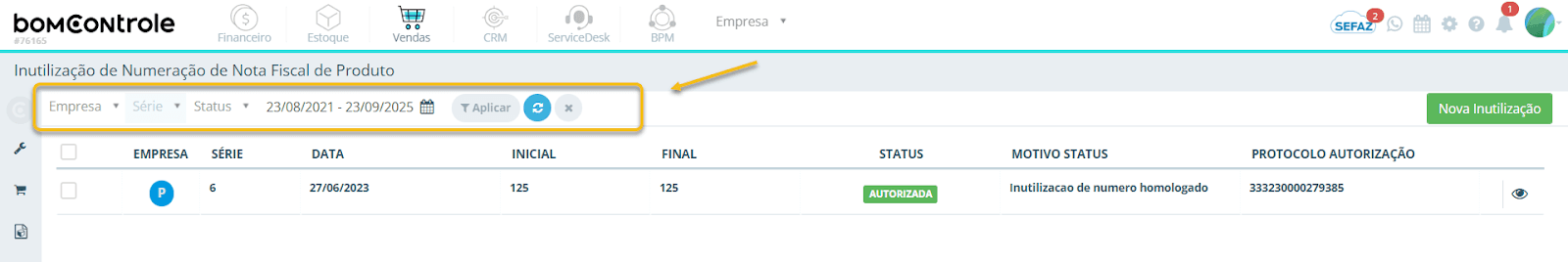 - Emissão de NF-e: após uma inutilização ser aprovada/autorizada, qualquer tentativa de emitir uma NF-e utilizando número, série, empresa e ano correspondentes àquele intervalo será impedida pelo sistema (e pelo SEFAZ). O BomControle, ao gerar uma nova nota fiscal, normalmente já pula para o próximo número válido. Portanto, cadastre inutilizações sempre que identificar saltos ou números não emitidos, para manter a sequência fiscal regularizada.