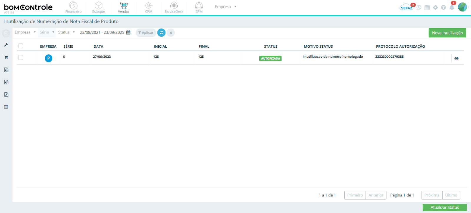 Status: o estado atual da inutilização, indicado por um rótulo colorido: por exemplo, Pendente (etiqueta cinza), Aprovado ou Autorizada (etiqueta verde), Negada (etiqueta vermelha). O status reflete o retorno da SEFAZ quanto à solicitação (detalhado na seção de Status mais adiante).