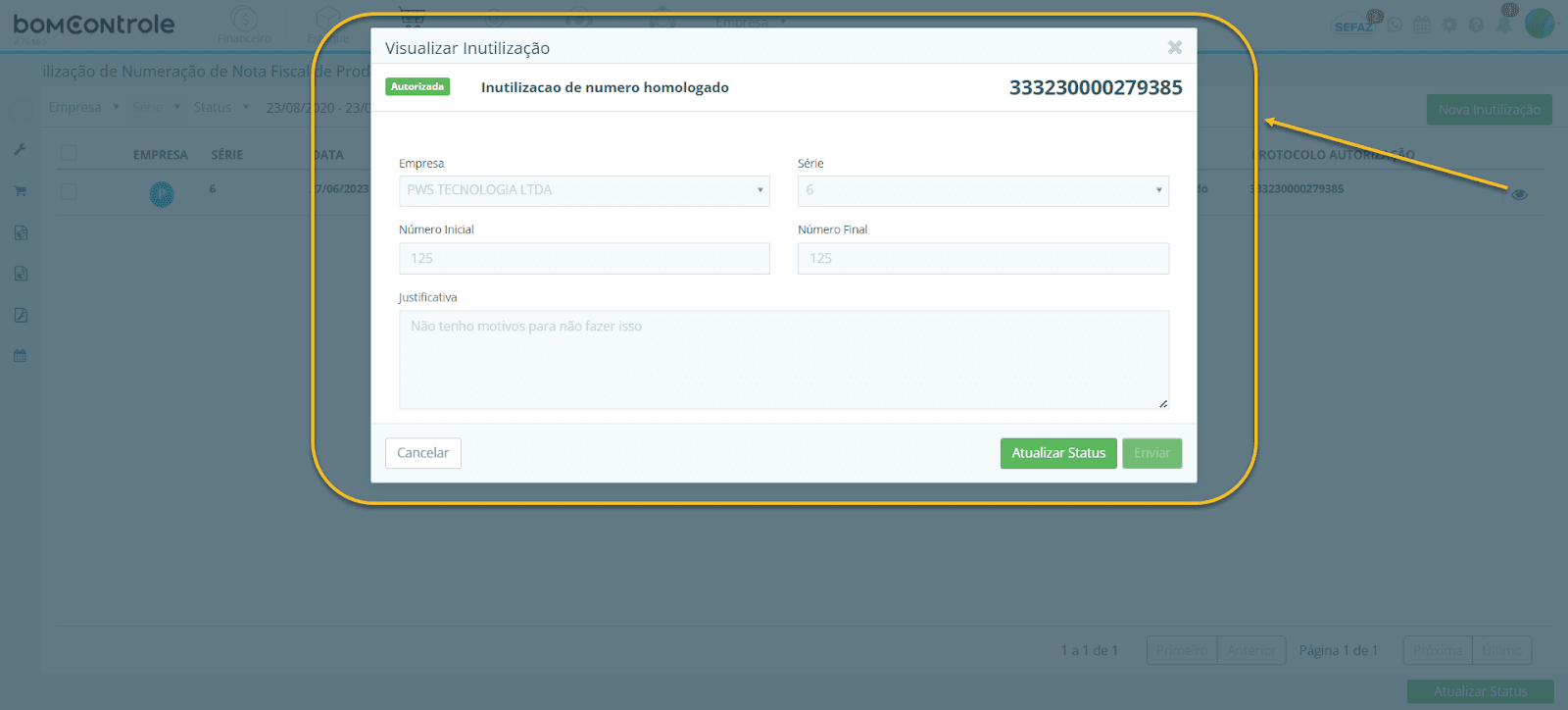 No modo de Visualização de uma inutilização existente, os campos acima aparecem apenas para consulta, desabilitados. Nessa situação, a tela exibe também, no topo, um resumo do Status, Motivo e Protocolo da inutilização conforme retornado pela SEFAZ. O botão Enviar permanecerá visível porém inativo (desabilitado), e em seu lugar o usuário pode usar o botão Atualizar Status para forçar a consulta desse único registro novamente. Caso o usuário tenha permissão, ele poderá clicar em Atualizar Status dentro da visualização para atualizar a situação junto à SEFAZ.